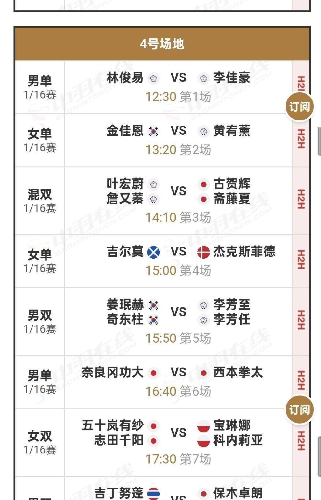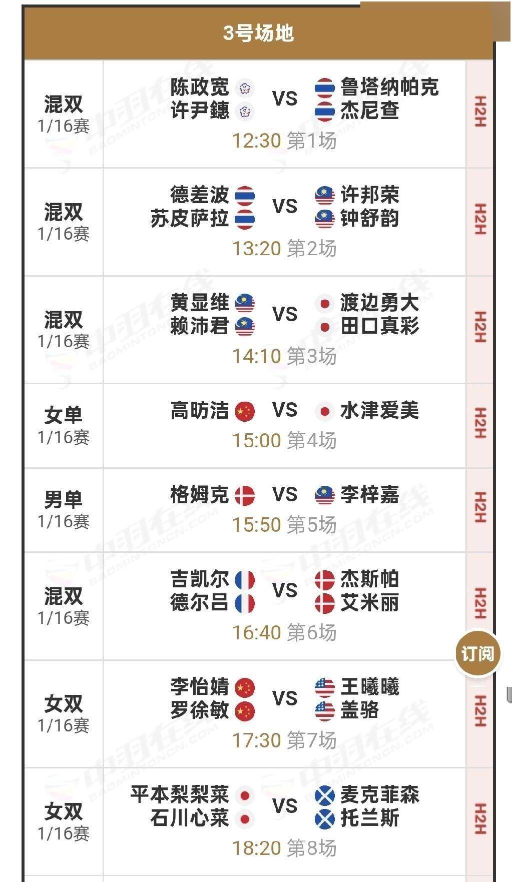 最晚登场的是男双组合梁伟铿和王昶,他们将在晚上6:30左右的1号场地迎战丹麦组合伦加德和麦斯。令人惊讶的是,这两对组合之前竟然没有任何交手记录。